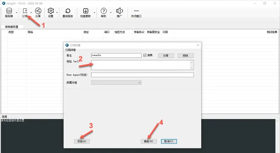启动v2rayN客户端,你将看到一个简单的界面。点击界面右上角的”服务器”按钮,然后选择”编辑订阅”。在弹出的对话框中,点击”添加”按钮,并输入你的订阅链接。点击”确定”保存订阅设置。