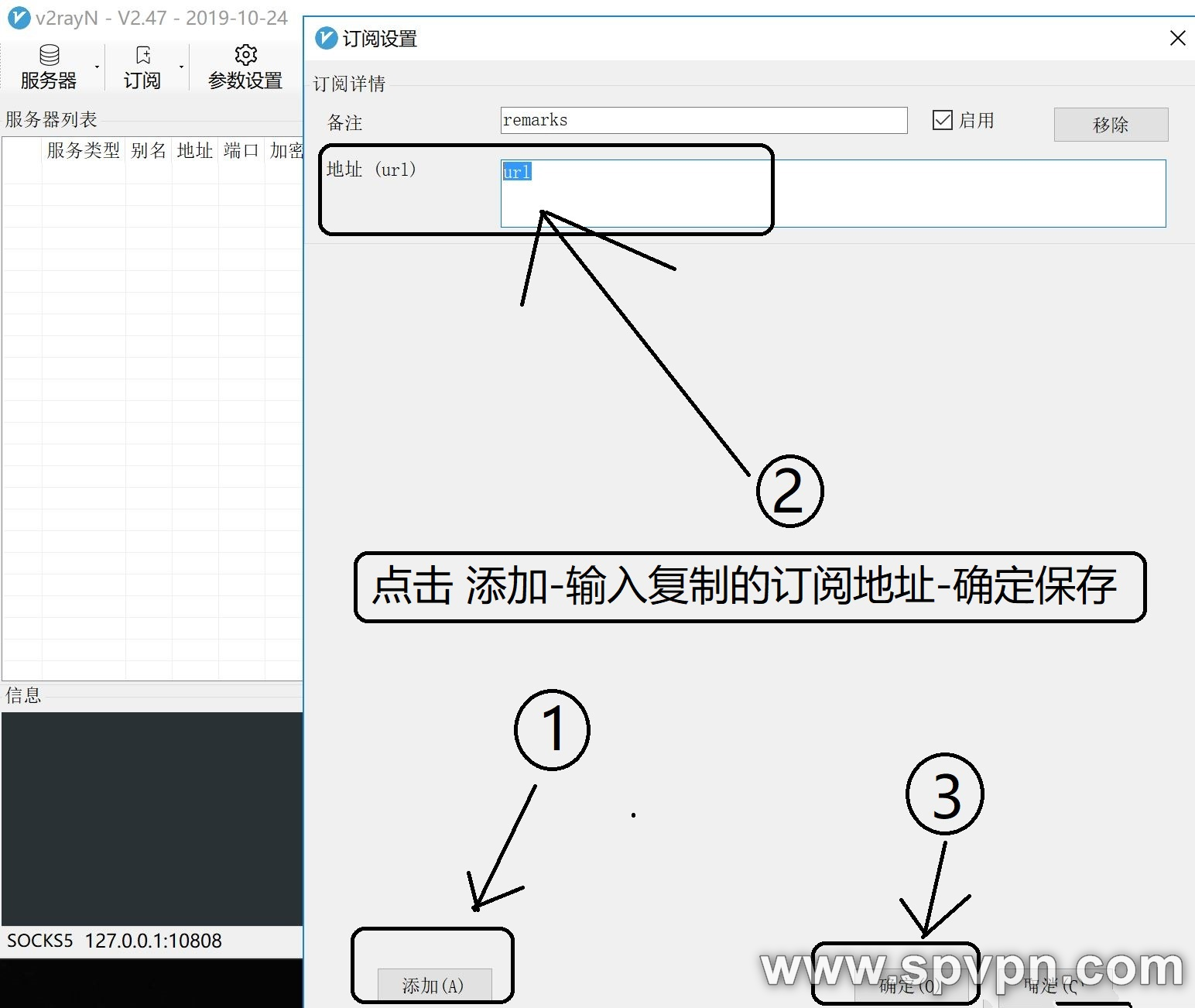 打开v2rayN软件,选择“订阅—订阅设置—添加”,在 “地址(url)” 右侧框内粘贴套餐内找到的订阅链接Subscription Link; 点击 ”确定“ 进行保存。