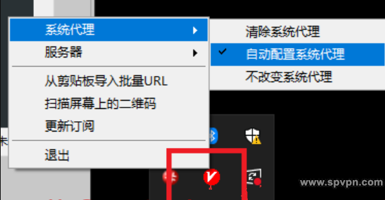 Windows电脑右下角托盘找到v2rayN图标,在图标上点击右键“系统代理”—-“自动配置系统代理”,此时图标会变成红色。