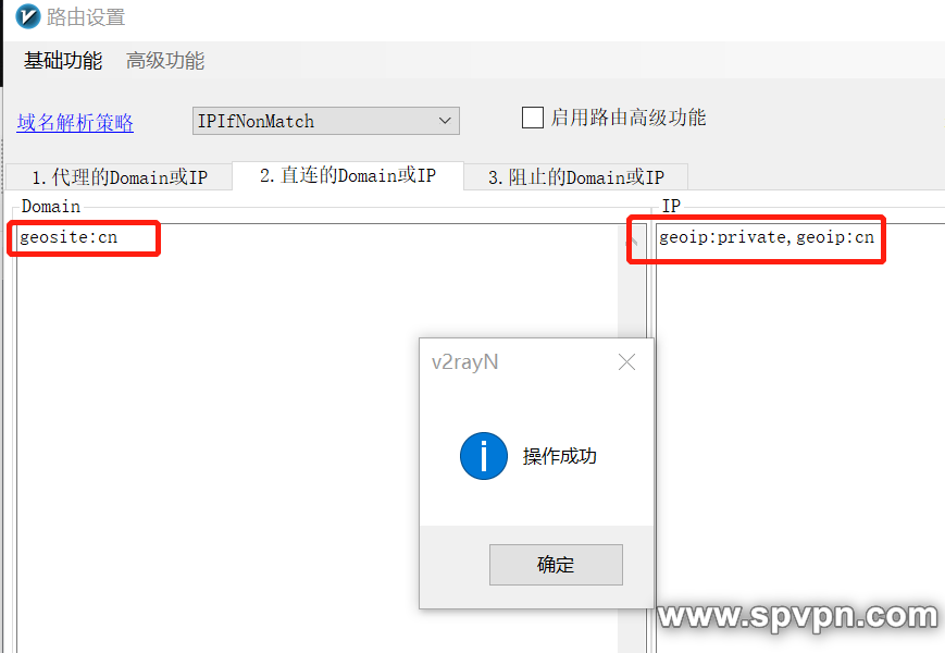 如果想让某个网站走代理而不是直连,那么在上图中“代理的Domain或IP”的左边加一行:domain:网站域名,