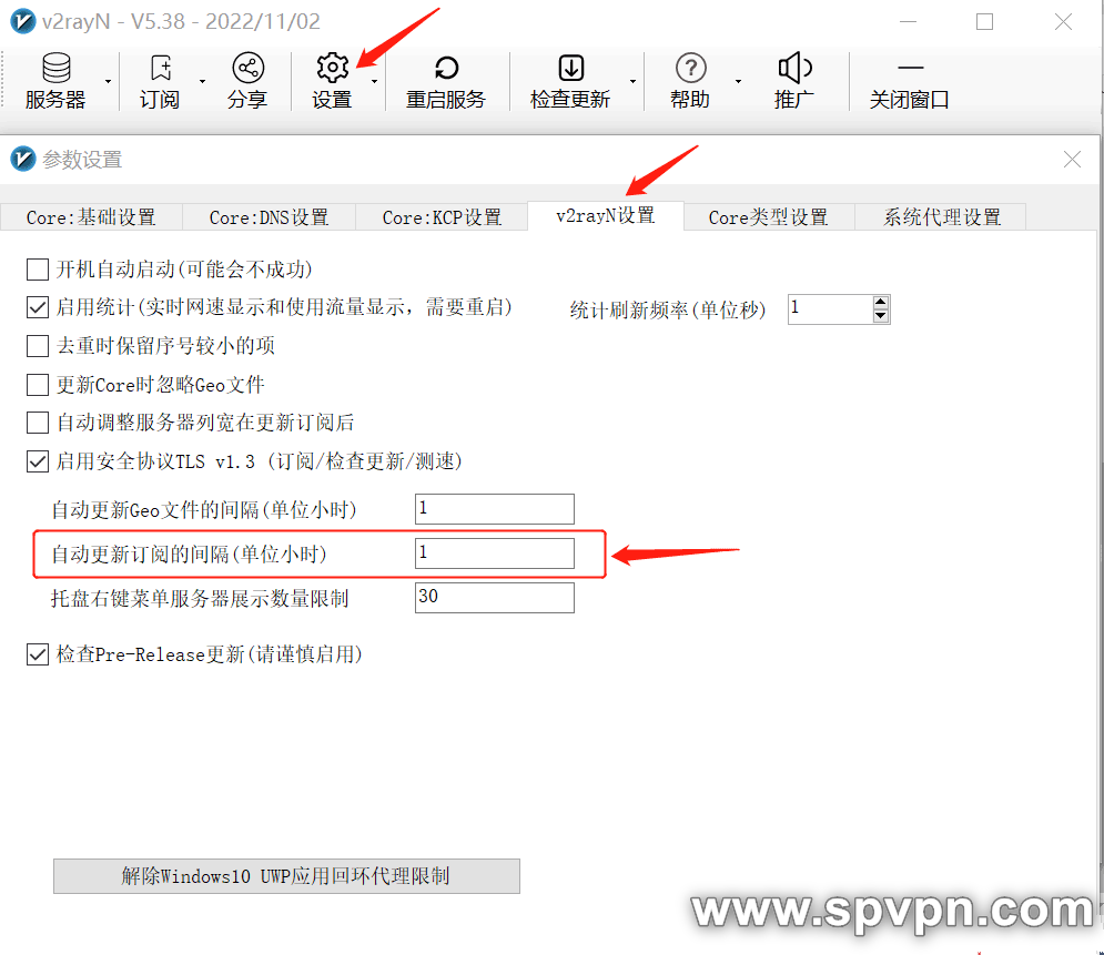 v2rayN软件打开进行操作:”设置—参数设置—v2rayN设置—-自动更新订阅的间隔(单位小时)—确定“