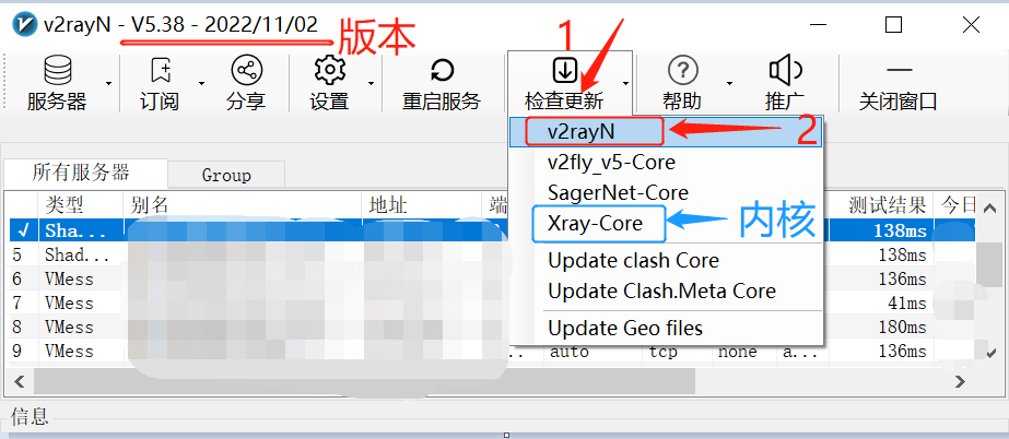 软件左上方可以看到软件版本,比如: v2rayN – V5.38 – 2022/11/02(目前都是4.0以上版本)