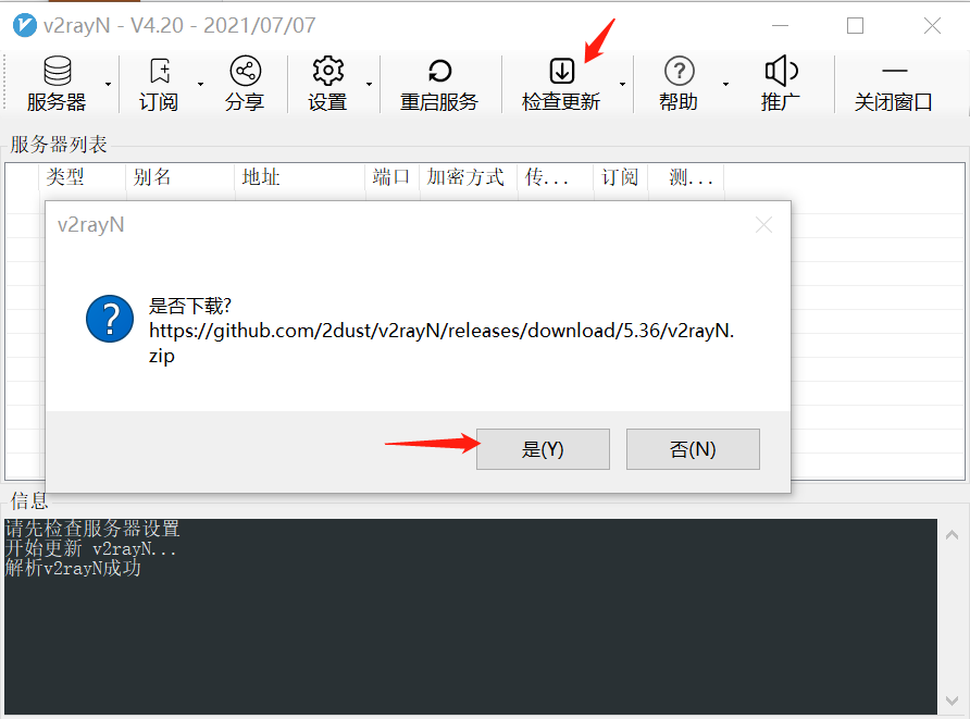 点击软件上方的 ”检查更新“;选择 “v2rayN” ,