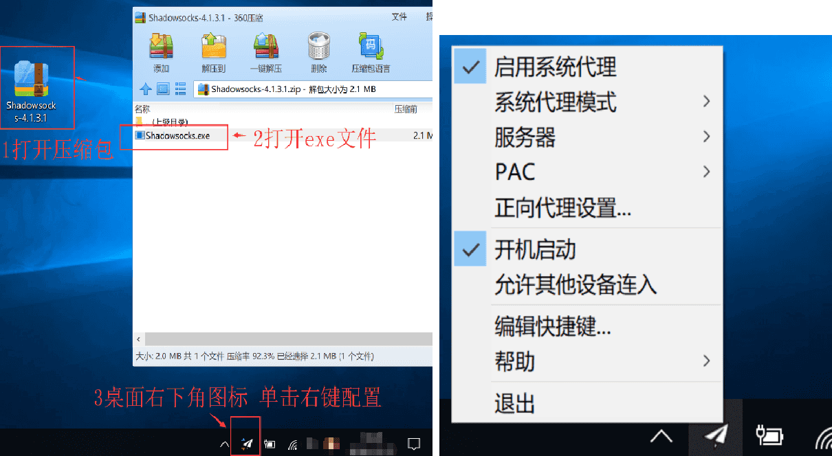 1、下载后解压文件,打开EXE文件安装后,右键单击左下角任务栏的Shadowsocks【小飞机图标】进行配置。