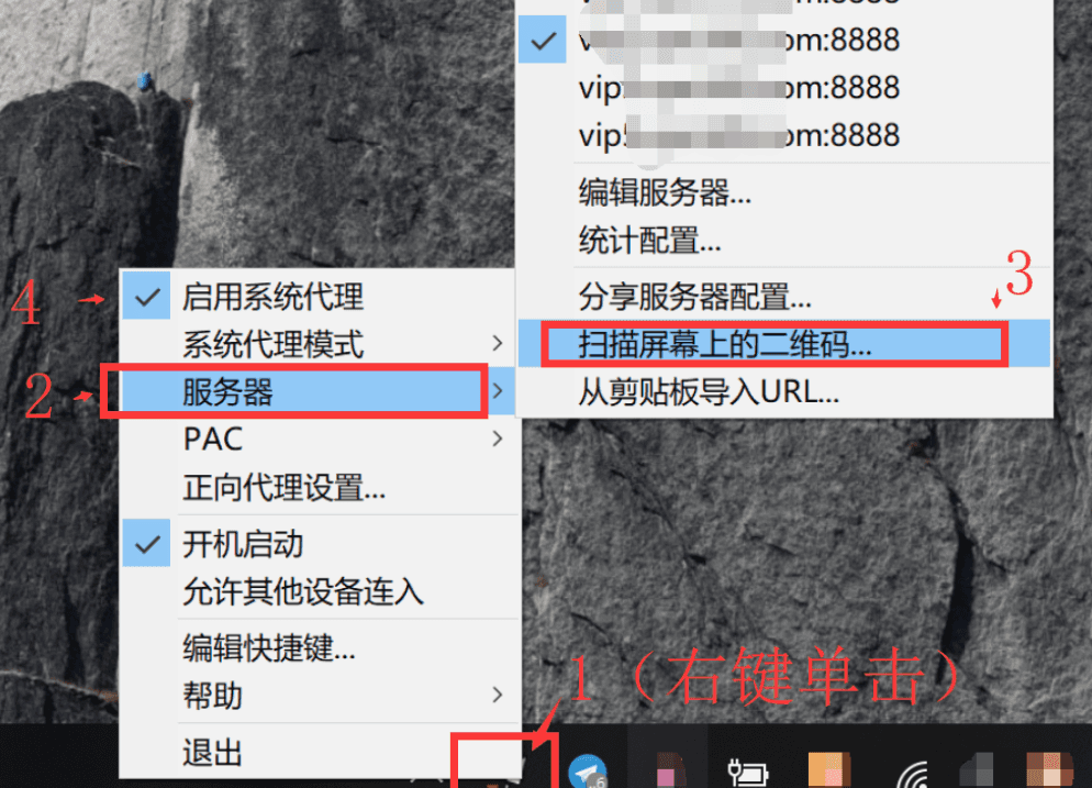 2、然后右键单击右下角的软件,点击“服务器”-“扫描屏幕上的二维码”