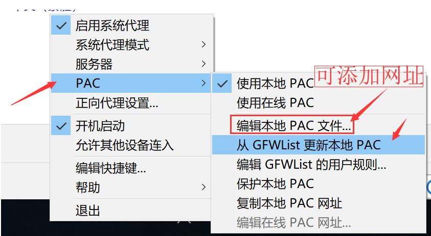需要更新PAC:依次操作:PAC ->从GFW List更新PAC (等待更新完毕后)->使用本地PAC->启动系统代理。