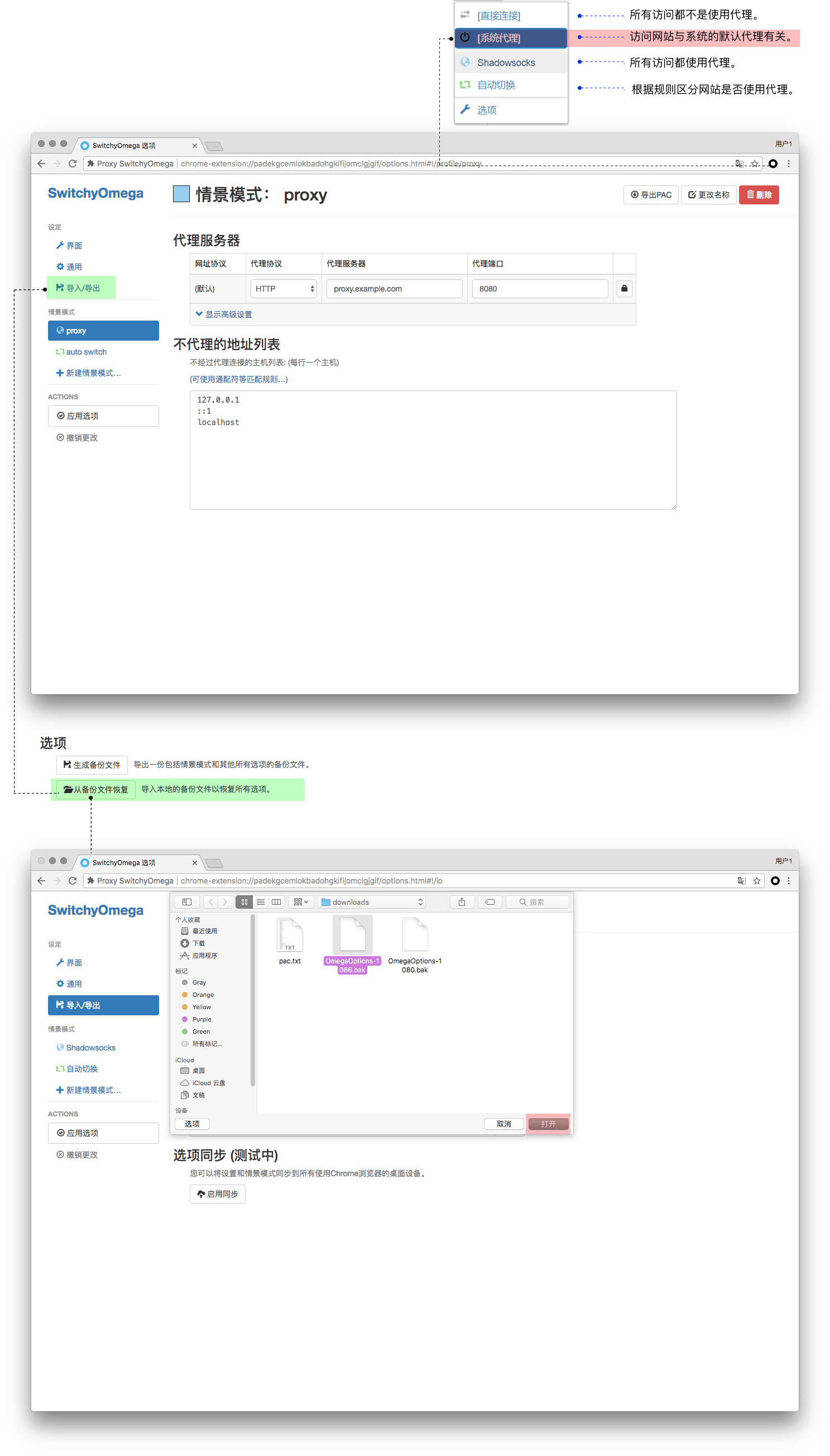 备份和恢复: 您是否担心丢失精心配置的配置文件?SwitchyOmega 的备份和还原功能可以让您放心。
